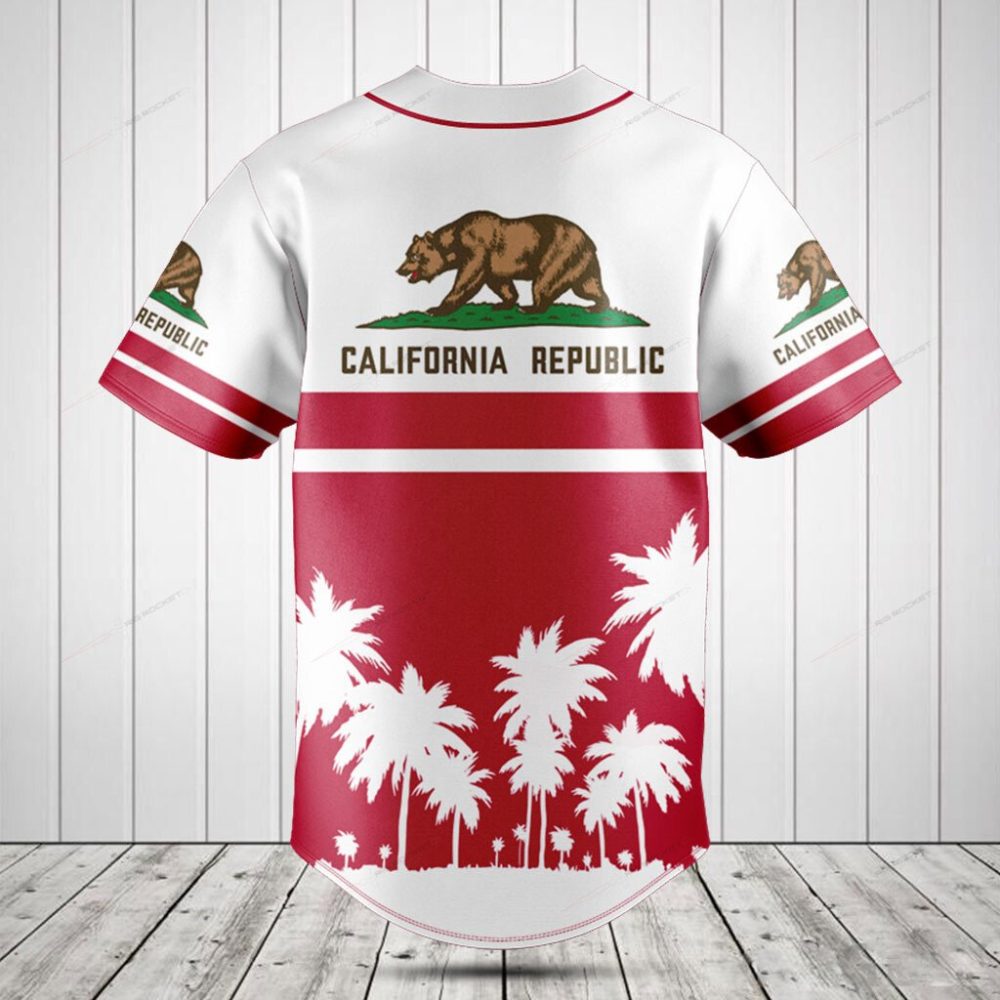 Be the first to review “California Republic Baseball Jersey – Stylish Red & White Palm Design Shirt”
