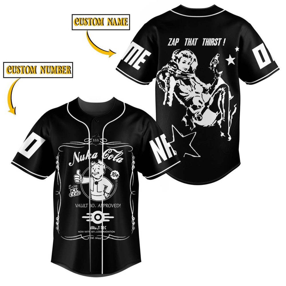 Be the first to review “Customizable Nuka Cola Baseball Jersey – Personalized Name & Number, Black Vintage Style”