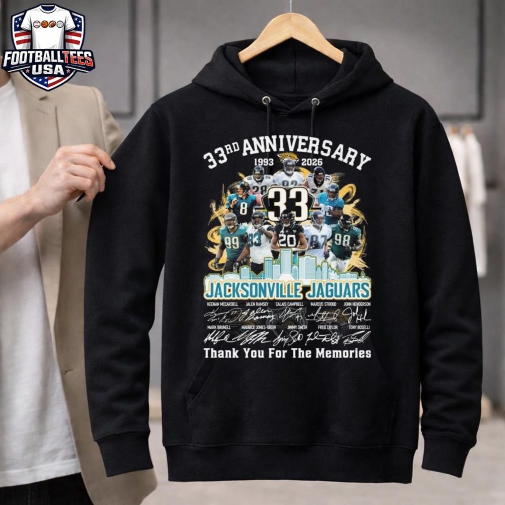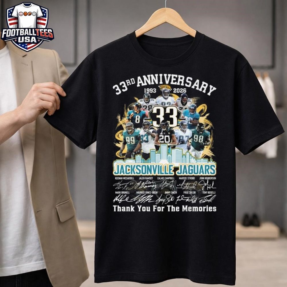 Be the first to review “Jacksonville Jaguars Skyline 33Th Anniversary 1993-2026 Players Signatures Thank You For The Memories Unisex Shirt”