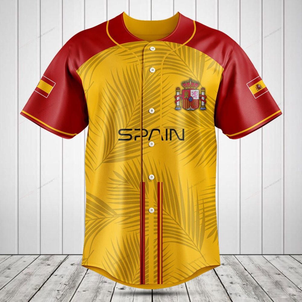 Be the first to review “Spain Baseball Jersey – Stylish Red & Yellow Team Shirt With Palm Leaf Design”