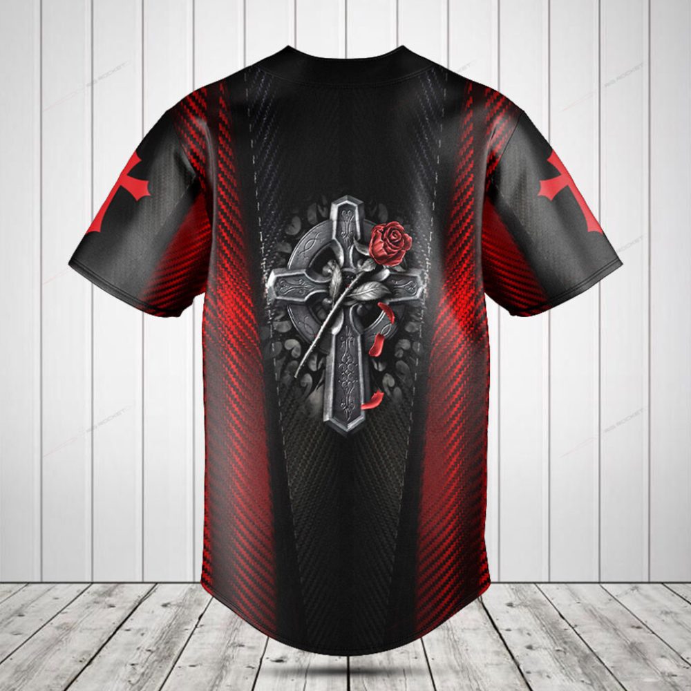 Be the first to review “Stylish Gothic Cross & Rose Baseball Jersey – Unique Red & Black Design For Men”